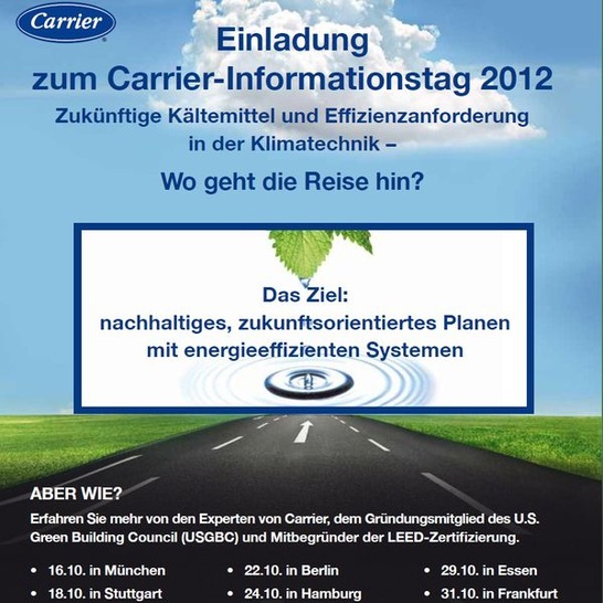 Carrier lädt im Oktober 2012 zu seinen traditionellen Informationstagen ein. Im Mittelpunkt stehen aktuelle Themen und Entwicklungen: Es geht um den aktuellen Stand bei der Revision der F-Gase-Verordnung und die Auswirkungen auf zukünftige Kältemittel, um die anstehenden Umsetzungsverordnungen der Öko-Design-Richtlinie zur Verbesserung der Energieeffizienz in gewerblichen Klimasystemen. Carrier-Experten präsentieren Wirtschaftlichkeitsberechnungen für drehzahlgeregelte Flüssigkeitskühler mit der Vorstellung des neuen Flüssigkeitskühlers 30XW-V. Des Weiteren werden die Energie-Einsparpotenziale von AquaSmart-Hydroniksystemen sowie Regelungskonzepte zur Effizienzverbesserung vorgestellt.