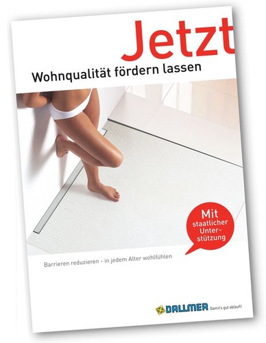 Wer eine Wohnung barrierearm gestalten möchte, sollte sich um staatliche oder regionale Fördergelder bewerben. Denn es gibt mehrere Förderprogramme, mit denen Eigentümer, Vermieter und Mieter bei der Modernisierung unterstützt werden, auch bei der nachhaltigen und bewohnerfreundlichen (Um-)Gestaltung des Bades durch Einbau einer bodengleichen Dusche. Die neue Förderbroschüre von Dallmer bringt dazu übersichtlich aufbereitete Informationen. Beschrieben werden auf 48 Seiten die bundesweit geltenden Fördermaßnahmen sowie regionale Unterstützungen. 13 der 16 Bundesländer haben eigene Programme, die systematisch dargestellt werden. Meistens handelt es sich um zinsverbilligte Darlehen, teilweise um direkte Zuschüsse. Für vertiefende Informationen steht am Ende jedes Kapitels ein Internet-Link zum jeweiligen Förderprogramm. Um sie aktuell halten zu können, steht die Förderbroschüre als PDF-Datei zur Verfügung.