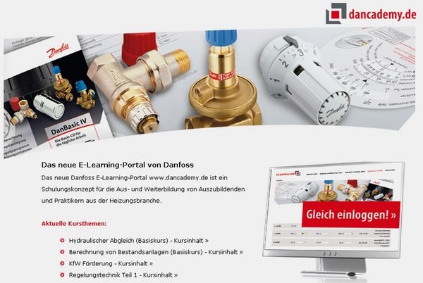 Wie auch bei den Systemschulungen sind in dem Online-Portal www.dancademy.de die Funktion und das Zusammenwirken einzelner Komponenten in Heizungsanlagen anschaulich demonstriert. Initiatoren waren Bernd Scheithauer, Ingenieur bei Danfoss und Entwickler der Internetseite www.hydraulischer-abgleich.de , sowie Dr.-Ing. Dieter Pfannstiel, Fachautor für Regelungs- und Systemtechnik. Die Dancademy wird fortlaufend durch sie gepflegt und ergänzt. ToR