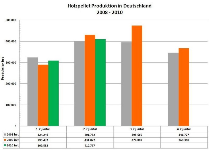 Die Pelletproduktion verläuft in Deutschland auch im Jahr 2010 auf hohem Niveau. Mit ca. 410.000 t von April bis Juni 2010 produzierten Holzpellets wurde ein mit dem Vorjahr (430.000 t) vergleichbarer Wert erreicht. Gegenüber dem 1. Quartal 2010 ist nach den Erhebungen des Deutschen Energieholz- und Pellet-Verbands (