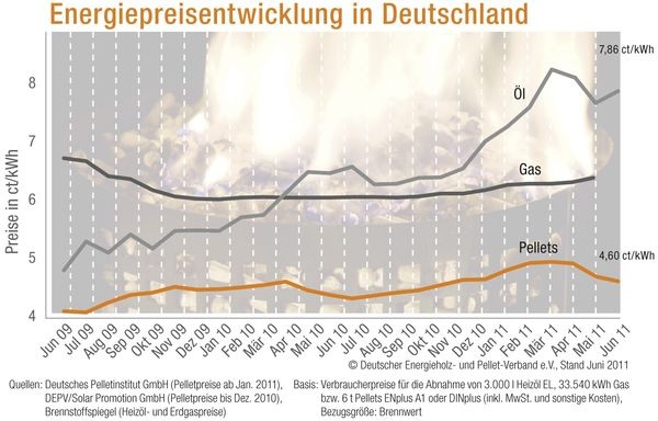 ) berichtet, betrug der Durchschnittspreis im Juni 225,07 (Mai 2011: 227,30) Euro/t. Der DEPV erhebt seit Jahresbeginn 2011 über das Deutsche Pelletinstitut (