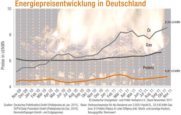 ) berichtet, betrug der Durchschnittspreis im November 235,99 (Oktober 2011: 232,76) Euro/t. Der DEPV erhebt seit Jahresbeginn 2011 über das Deutsche Pelletinstitut (