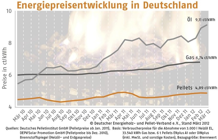 Der Bezugspreis für Holzpellets in Deutschland ist im März 2012 geringfügig gesunken (–0,2 %). Wie der Deutsche Energieholz- und Pellet-Verband (