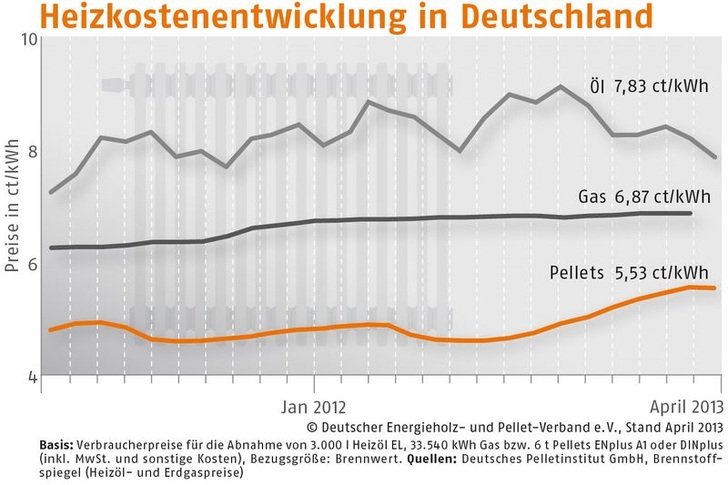 ) berichtet, betrug der Durchschnittspreis im April 270,88 (Vormonat: 272,02; Vorjahresmonat: 230,40) Euro/t. Holzpellets sind damit im April 2013 gegenüber dem Vorjahr um 17,6 % teurer. Es ist jedoch zu erwarten, dass der Preis für Holzpellets durch ein größeres Rohstoffaufkommen in den nächsten Wochen sinken wird. Der DEPV erhebt seit Jahresbeginn 2011 über das Deutsche Pelletinstitut (