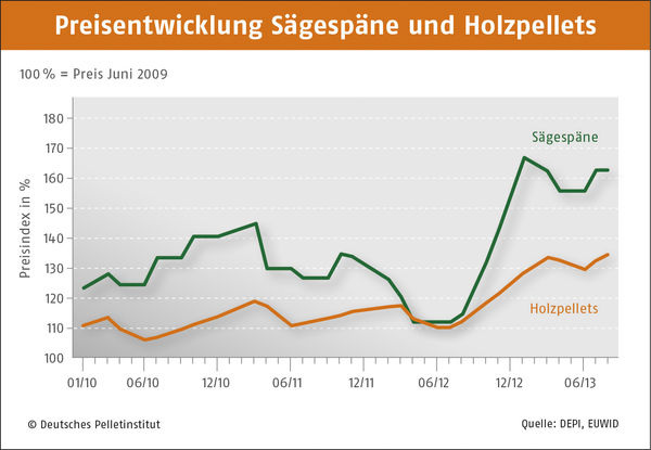 Im September 2013 kosteten Holzpellets in Süddeutschland 280,25 (Vormonat: 277,62) Euro/t, in Deutschland Mitte 273,58 (Vormonat: 270,16) Euro/t und in der Region Nord-/Ostdeutschland 270,64 (Vormonat: 268,93) Euro/t. Der DEPV-Index ist der Durchschnittspreis in Deutschland für eine Tonne Holzpellets der Qualitätsklasse ENplus A1 bzw. DINplus (Abnahme 6 t, Lieferung im Umkreis 50 km, inkl. aller Nebenkosten und MwSt.). Der Index wird zur Monatsmitte veröffentlicht.