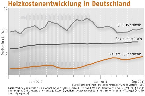 Größere Mengen (26 t) wurden im September 2013 zu folgenden Konditionen gehandelt: Süd: 267,79 (Vormonat: 264,42) Euro/t, Mitte: 257,85 (Vormonat: 254,86) Euro/t, Nord/Ost: 253,85 (Vormonat: 253,29) Euro/t. Der DEPV rät den Betreibern größerer Pelletfeuerungen, den vom Verband veröffentlichten Ausschreibungsvertrag mit Preisindexierung zu nutzen.