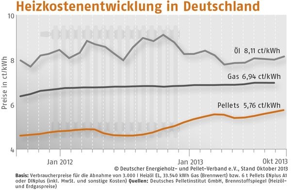 Im Oktober 2013 kosteten Holzpellets in Süddeutschland 285,14 (Vormonat: 280,25) Euro/t, in Deutschland Mitte 278,75 (Vormonat: 273,58) Euro/t und in der Region Nord-/Ostdeutschland 278,84 (Vormonat: 270,64) Euro/t. Der DEPV-Index ist der Durchschnittspreis in Deutschland für eine Tonne Holzpellets der Qualitätsklasse ENplus A1 bzw. DINplus (Abnahme 6 t, Lieferung im Umkreis 50 km, inkl. aller Nebenkosten und MwSt.). Der Index wird zur Monatsmitte veröffentlicht.