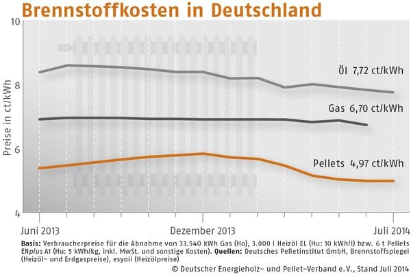 Im Juli 2014 kosteten Holzpellets in Süddeutschland 248,86 (Vormonat: 247,42) Euro/t, in Deutschland Mitte 244,50 (Vormonat: 246,93) Euro/t und in der Region Nord-/Ostdeutschland 247,26 (Vormonat: 250,18) Euro/t. Der DEPV-Index ist der Durchschnittspreis in Deutschland für eine Tonne Holzpellets der Qualitätsklasse ENplus A1 (Abnahme 6 t, Lieferung im Umkreis 50 km, inkl. aller Nebenkosten und MwSt.).
