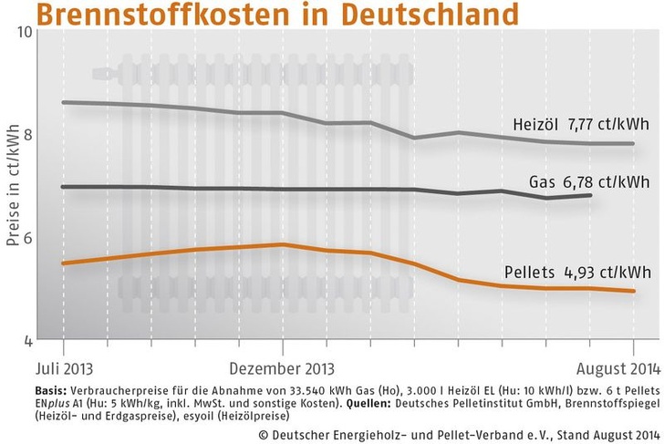 Im August 2014 kosteten Holzpellets in Süddeutschland 247,95 (Vormonat: 248,86) Euro/t, in Deutschland Mitte 243,69 (Vormonat: 244,50) Euro/t und in der Region Nord-/Ostdeutschland 244,98 (Vormonat: 247,26) Euro/t. Der DEPV-Index ist der Durchschnittspreis in Deutschland für eine Tonne Holzpellets der Qualitätsklasse ENplus A1 (Abnahme 6 t, Lieferung im Umkreis 50 km, inkl. aller Nebenkosten und MwSt.).