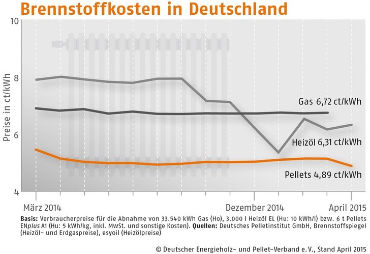 Im April 2015 kosteten Holzpellets in Süddeutschland 242,64 (Vormonat: 255,20) Euro/t, in Deutschland Mitte 243,30 (Vormonat: 253,83) Euro/t und in der Region Nord-/Ostdeutschland 248,14 (Vormonat: 260,83) Euro/t. Der DEPV-Index ist der Durchschnittspreis in Deutschland für eine Tonne Holzpellets der Qualitätsklasse ENplus A1 (Abnahme 6 t, Lieferung im Umkreis 50 km, inkl. aller Nebenkosten und MwSt.).Regionale Preise für 26 t
