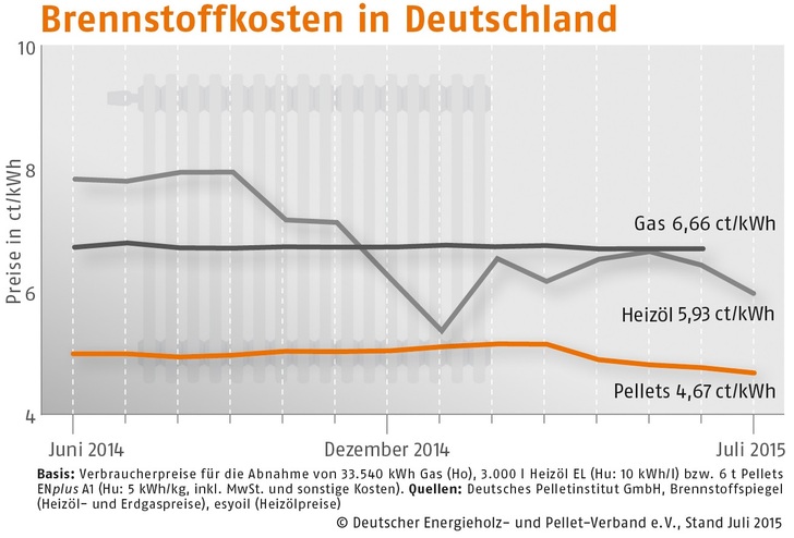 Im Juli 2015 kosteten Holzpellets in Süddeutschland 232,53 (Vormonat: 236,46) Euro/t, in Deutschland Mitte 232,71 (Vormonat: 237,09) Euro/t und in der Region Nord-/Ostdeutschland 241,16 (Vormonat: 241,40) Euro/t. Der DEPV-Index ist der Durchschnittspreis in Deutschland für eine Tonne Holzpellets der Qualitätsklasse ENplus A1 (Abnahme 6 t, Lieferung im Umkreis 50 km, inkl. aller Nebenkosten und MwSt.).