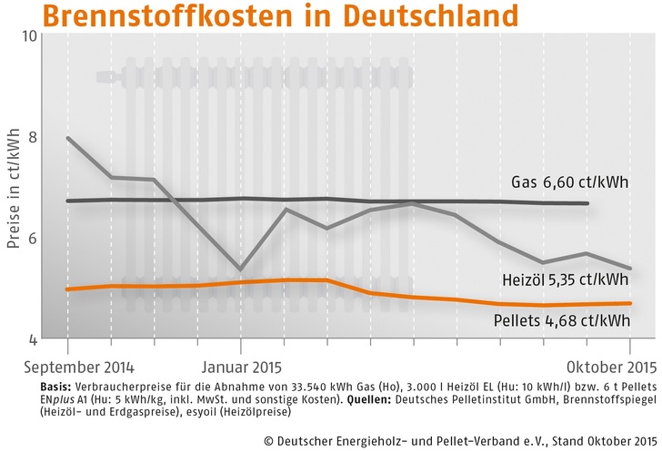 Im Oktober 2015 kosteten Holzpellets in Süddeutschland 232,25 (Vormonat: 231,84) Euro/t, in Deutschland Mitte 233,91 (Vormonat: 231,06) Euro/t und in der Region Nord-/Ostdeutschland 238,70 (Vormonat: 243,33) Euro/t. Der DEPV-Index ist der Durchschnittspreis in Deutschland für eine Tonne Holzpellets der Qualitätsklasse ENplus A1 (Abnahme 6 t, Lieferung im Umkreis 50 km, inkl. aller Nebenkosten und MwSt.).