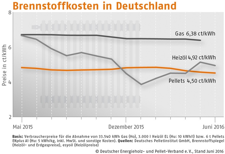 Im Juni 2016 kosteten Holzpellets in Süddeutschland 223,48 (Vormonat: 224,02) Euro/t, in Deutschland Mitte 222,80 (Vormonat: 227,42) Euro/t und in der Region Nord-/Ostdeutschland 232,52 (Vormonat: 235,32) Euro/t. Der DEPV-Index ist der Durchschnittspreis in Deutschland für eine Tonne Holzpellets der Qualitätsklasse ENplus A1 (Abnahme 6 t, Lieferung im Umkreis 50 km, inkl. aller Nebenkosten und MwSt.).