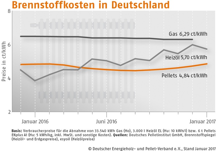 Im Januar 2017 kosteten Holzpellets in Süddeutschland 245,09 (Vormonat: 234,12) Euro/t, in Deutschland Mitte 238,71 (Vormonat: 234,81) Euro/t und in der Region Nord-/Ostdeutschland 241,63 (Vormonat: 237,37) Euro/t. Der DEPV-Index ist der Durchschnittspreis in Deutschland für eine Tonne Holzpellets der Qualitätsklasse ENplus A1 (Abnahme 6 t, Lieferung im Umkreis 50 km, inkl. aller Nebenkosten und MwSt.).