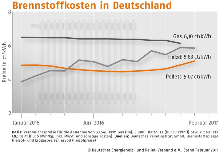 Im Februar 2017 kosteten Holzpellets in Süddeutschland 256,27 (Vormonat: 245,09) Euro/t, in Deutschland Mitte 250,28 (Vormonat: 238,71) Euro/t und in der Region Nord-/Ostdeutschland 246,34 (Vormonat: 241,63) Euro/t. Der DEPV-Index ist der Durchschnittspreis in Deutschland für eine Tonne Holzpellets der Qualitätsklasse ENplus A1 (Abnahme 6 t, Lieferung im Umkreis 50 km, inkl. aller Nebenkosten und MwSt.).