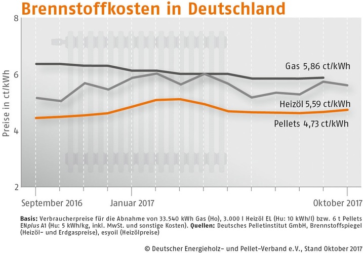 Im Oktober 2017 kosteten Holzpellets in Süddeutschland 234,15 (Vormonat: 231,85) Euro/t, in Deutschland Mitte 236,56 (Vormonat: 232,28) Euro/t und in der Region Nord-/Ostdeutschland 237,40 (Vormonat: 233,70) Euro/t. Der DEPV-Index ist der Durchschnittspreis in Deutschland für eine Tonne Holzpellets der Qualitätsklasse ENplus A1 (Abnahme 6 t, Lieferung im Umkreis 50 km, inkl. aller Nebenkosten und MwSt.).