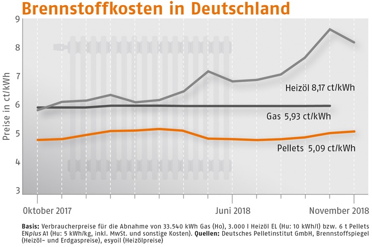 Im November 2018 kosteten Holzpellets in Süddeutschland 256,87 (Vormonat: 251,07) Euro/t, in Deutschland Mitte 248,83 (Vormonat: 247,55) Euro/t und in der Region Nord-/Ostdeutschland 254,36 (Vormonat: 248,30) Euro/t. Der DEPV-Index ist der Durchschnittspreis in Deutschland für eine Tonne Holzpellets der Qualitätsklasse ENplus A1 (Abnahme 6 t, Lieferung im Umkreis 50 km, inkl. aller Nebenkosten und MwSt.).