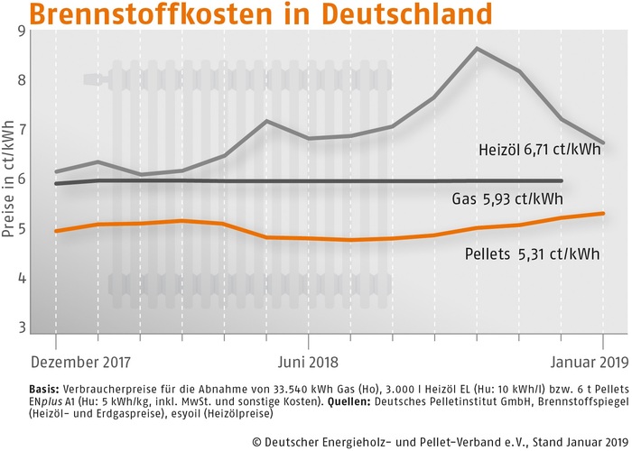 Im Januar 2019 kosteten Holzpellets in Süddeutschland 267,22 (Vormonat: 262,24) Euro/t, in Deutschland Mitte 261,23 (Vormonat: 257,33) Euro/t und in der Region Nord-/Ostdeutschland 265,10 (Vormonat: 258,29) Euro/t. Der DEPV-Index ist der Durchschnittspreis in Deutschland für eine Tonne Holzpellets der Qualitätsklasse ENplus A1 (Abnahme 6 t, Lieferung im Umkreis 50 km, inkl. aller Nebenkosten und MwSt.).