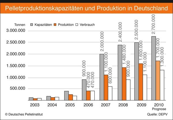 Der Inlandsverbrauch von Holzpellets ist 2009 gegenüber dem Vorjahr um 200.000 t auf 1,1 Mio. t gestiegen. Allerdings werden in Deutschland immer noch erheblich mehr Pellets produziert als verbraucht. 28 % der Produktion wurden 2009 exportiert (2008: 40 %). Nicht zuletzt wegen einer Zunahme der bei Gewerbe und Kommunen betriebenen großen Pelletheizungen geht man beim DEPV für 2010 von einer weiteren Zunahme des Inlandsverbrauchs auf rund 1,3 Mio. t aus. Als Rohstoffgrundlage für die Pelletproduktion standen 2009 Sägeresthölzer mit einem Anteil von etwa 70 % weiterhin an erster Stelle. Rund 30 % der Pellets wurden aus nicht sägefähigen Rundholzsortimenten produziert. Durch die rückläufige Schnittholzproduktion und einer damit einhergehenden Reduktion von Sägeresthölzern ist der Anteil dieser Holzsortimente gegenüber 2008 angestiegen. Keine nennenswerte Rolle spielten für die Pelletproduktion bislang Hölzer aus landwirtschaftlichen Kurzumtriebsplantagen.