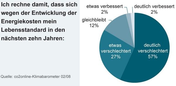 Wie werden sich die Energiepreise entwickeln? Auf welchen Energieträger kann ich mich zukünftig verlassen? Welche Maßnahmen wirken gegen Klimawandel und Energiepreissteigerung? Die Meinung in der Bevölkerung zu diesen und weiteren Themen aus den Bereichen Energiepreise, Versorgungssicherheit und Klimaschutz ermittelt quartalsweise das neue co2online-Klimabarometer durch Online-Befragungen. In der aktuellen Klimabarometer-Ausgabe erwarten 84% der 1600 Befragten eine Verschlechterung ihres Lebensstandards durch die aktuelle Energiepreisentwicklung, 57% eine deutliche Verschlechterung. Durchschnittlich wird eine Energiepreissteigerung in den nächsten zehn Jahren für Heizöl und Erdgas um je 10%, für Pellets und Fernwärme um je 9% und für Strom um 8% angenommen.