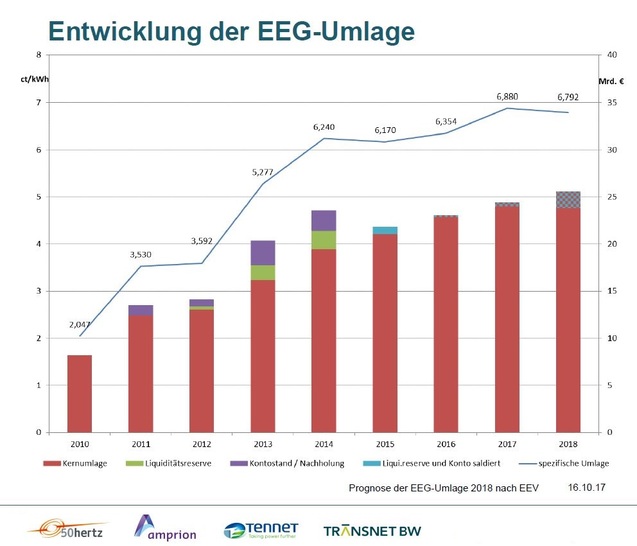 Die vier deutschen Übertragungsnetzbetreiber 50Hertz, Amprion, TenneT und TransnetBW haben heute die EEG-Umlage für das Jahr 2018 veröffentlicht. Sie beträgt 6,792 Ct/kWh und ist damit 1,3 % niedriger als im Vorjahr (2017: 6,880 Ct/kWh).