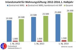 Die gemeinsame Statistik vom Fachverband Gebäude-Klima (FGK) und vom Bundesindustrieverband Deutschland Haus-, Energie- und Umwelttechnik (BDH) weist für Januar bis Juni 2014 hochgerechnet rund 26.500 verkaufte Zentralgeräte mit Wärmerückgewinnung aus. Diese Zahl setzt sich aus etwa 25.000 vom Heizsystem unabhängigen Zentralgeräten (+11 %) und 1500 (+20 %) mit Wärmepumpe kombinierten, kompakten Zentralgeräten zusammen.