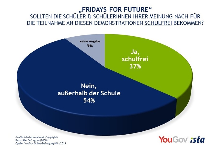 Auf die Frage, ob Schülerinnen und Schüler für die Teilnahme an den „Fridays for Future“-Demonstrationen schulfrei bekommen sollten, antwortet die Mehrheit der Deutschen mit Nein. Die Demonstrationen sollten außerhalb des Unterrichts in der Freizeit stattfinden (54 %). Immerhin 37 % sprechen sich für ein Schulfrei aus, das die Teilnahme ermöglicht.