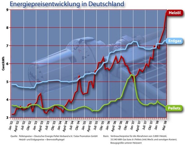 Der niedrige Preis bei Holzpellets ist teilweise „historisch“ bedingt: Der durch massive Nachfrage ausgelöste steile Preisanstieg Ende 2006 hat das Vertrauen der Verbraucher in die Preisunabhängigkeit vom Erdöl schwer beschädigt. In der Folge ist der Absatz von Pellet-Heizkesseln extrem rückläufig gewesen. Gleichzeitig hat die Branche in die Produktionskapazitäten und Lieferfähigkeit massiv investiert, sitzt nun aber auf Überkapazitäten. Bis Ende Mai war beim Absatz von Pellet-Heizkesseln nur eine leichte Steigerung gegenüber dem (besonders schlechten) Vorjahr zu verzeichnen. Mit den Preisgarantien vieler Hersteller können Verbraucher allerdings die gewünschte Unabhängigkeit vom Rohölpreis auf mehrere Jahre erreichen (siehe unten).