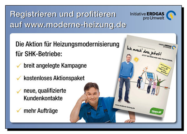 Mit einer bundesweiten Aktion wollen die Initiative Erdgas pro Umwelt (IEU) und die Erdgas Produkt- und Systemkampagne Verbraucher zur Modernisierung ihrer Heizung motivieren. SHK-Handwerksbetriebe, die von der Aktion profitieren und an der Handwerkervermittlung teilhaben wollen, können sich kostenlos unter