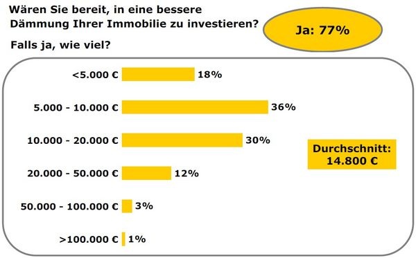 77 % der Eigentümer wären bereit, in eine bessere Dämmung ihrer selbstgenutzten Immobilie zu investieren. Diese Zahl hat eine repräsentative Umfrage (im Januar 2010) des Immobilienportals von Immowelt.de ergeben. Durchschnittlich 15.000 Euro würden die Sanierungswilligen danach für die energetische Sanierung der Gebäudehülle ausgeben. Dies entspricht etwa den Kosten für einen Fensteraustausch oder die Dachdämmung bei einem typischen Einfamilienhaus. Wer die eigenen vier Wände noch besser dämmen möchte, muss tiefer in die Tasche greifen. Auch hierzu scheinen einige Immobilienbesitzer bereit zu sein. Laut der Umfrage würden 12 % der Befragten zwischen 20.000 und 50.000 Euro investieren. Mit dieser Investitionssumme liegt diese Gruppe auf dem Niveau der von der KfW Bankengruppe ermittelten Zahlen: In einer im Juli 2010 veröffentlichten Studie weist die bundeseigene Förderbank durchschnittliche Sanierungskosten von 46.000 Euro aus.