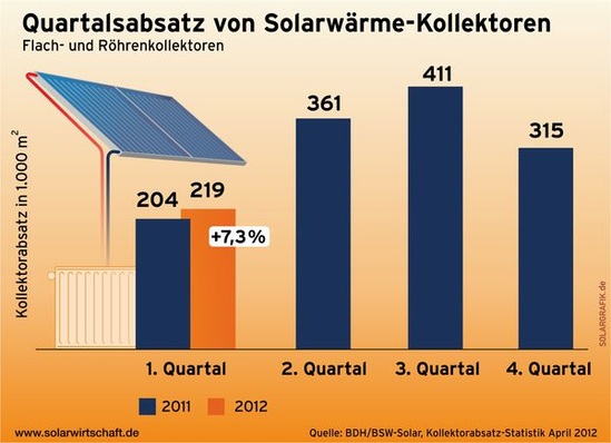 Auch im Bereich Solarthermie zeigte die Intersolar Europe 2012 die neuesten Entwicklungen in allen Bereichen der Industrie: Von der solaren Prozesswärme für industrielle Fertigungsprozesse, über innovative Heizkonzepte bis hin zu solarthermischen Großanlagen. Auch das neue Thema „Heizen mit Solarstrom“ im Vergleich zur Solarthermie wurde auf der Messe intensiv diskutiert und im Rahmen des Konferenz- und Rahmenprogramms beleuchtet. Über die Solarthermie-Marktentwicklung informierte der Bundesverband Solarwirtschaft (BSW-Solar), der auf der Messe die Studie Fahrplan Solarwärme präsentierte. Laut der Studie könne sich der Solarwärme-Markt in Deutschland bis zum Jahr 2030 versiebenfachen.
