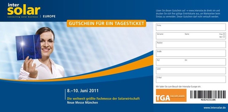 präsentiert die weltweit größte Fachmesse der Solarwirtschaft in 15 Messehallen über 2000 Aussteller. Mehr als 75.000 Fachbesucher werden erwartet. Um sich über die neusten Produkte und Dienstleistungen in den Bereichen Photovoltaik und Solarthermie zu informieren, erhalten TGA-Leser mit dem exklusiven TGA-Gutschein-Code