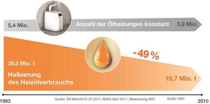 Obwohl die Anzahl der bundesweit installierten Ölheizungen laut Statistik des Schornsteinfegerhandwerks mit rund 6 Mio. Anlagen seit 1993 nahezu unverändert blieb, ging der Heizölverbrauch im selben Zeitraum um fast die Hälfte zurück. Einen maßgeblichen Anteil an dieser Entwicklung hat der Austausch alter Heizungen gegen effizientere Ölheiztechnik. Auch die Kombination von Ölheizungen und Solarthermie trägt zum geringeren Heizölverbrauch bei. In den vergangenen Jahren wurde etwa jede zweite neue Öl-Brennwertheizung gemeinsam mit einer Solarwärmeanlage installiert (Bericht von TGA Fachplaner).