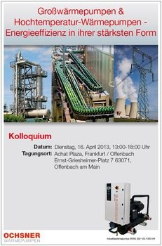 Beim Kolloquium „Großwärmepumpen & Hochtemperatur-Wärmepumpen“ am 16. April 2013 in Offenbach (Achat Plaza Frankfurt/Offenbach) werden die neue Technologie und ihre Anwendungsmöglichkeiten vom Ochsner-Entwicklungsteam und namhaften Experten aus Wissenschaft und Forschung präsentiert. Die halbtägige Veranstaltung (ab 13:00 Uhr) richtet sich an Energieverantwortliche, Anlagenplaner und Entscheidungsträger. ■