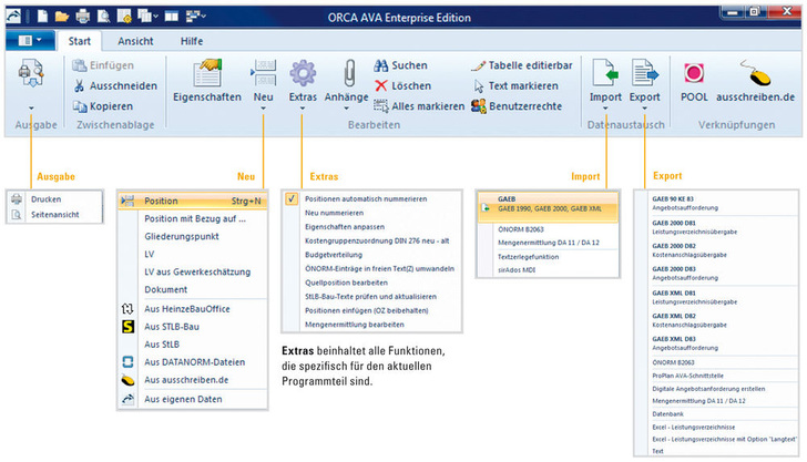 ORCA AVA unterstützt die aktuelle DIN 276-1 (2008) Hochbau sowie DIN 276-4 (2009) Ingenieurbau. Standardmäßig verfügt das Programm über zahlreiche Schnittstellen, z.B. GAEB 90/2000/XML, REB DA11 und REB DA12 und DATANORM. ORCA AVA ist GAEB-und STLB-zertifiziert. Der Datenimport aus externen Kostenermittlungsprogrammen, z.B. BKI Kostenplaner, DBD-Kostenelemente und sirAdos Kostenelemente wird unterstützt. Zur Detailschätzung kann der Planer auf Texthersteller zugreifen, die Leistungsbeschreibungen mit Baupreisen anbieten, z.B. STLB-Bau mit DBD-Baupreisen Regional und sirAdos. Die entsprechenden Schnittstellen gehören zum Lieferumfang. Mit der Prognose kann der Planer jederzeit den aktuellen Projektkostenstand prüfen. Besonders komfortabel kann er sich den Kostenverlauf anhand übersichtlicher Drucklayouts darstellen lassen, die auch für den Auftraggeber leicht verständlich sind.