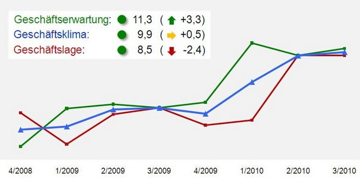 ), der sich aus der Bewertung der aktuellen Lage sowie den Erwartungen für das Folgequartal zusammensetzt, liegt zum Ende des 3. Quartals 2010 mit einem Wert von 9,9 auf einem neuen Höchststand und damit nochmals um 0,5 Punkte über dem Niveau des 2. Quartals (9,4). Damit setzt sich der Aufwärtstrend leicht fort. Die aktuelle Marktsituation kennzeichnet hohe Stabilität: Die Geschäftserwartung und Geschäftslage liegen auf annähernd gleichem Niveau von 8,5 bzw. 11.3.