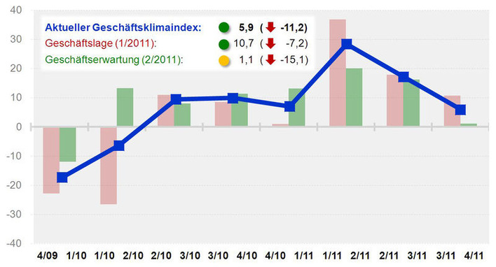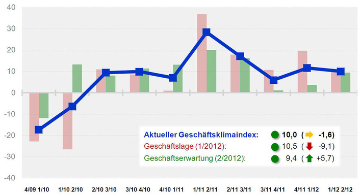 ) erhobene Geschäftsklimaindex der Kunststoffrohrhersteller hat sich im 2. Quartal 2012 massiv eingetrübt und ist mit einem Wert von –11,1 im 2. Halbjahr um 21 Punkte gegenüber dem 1. Quartal 2012 gefallen. Auch der Index für die Geschäftslage liegt mit –13,9 im deutlich negativen Bereich und ist damit im Vergleich zum Vorquartal um 24,4 Punkte gesunken.