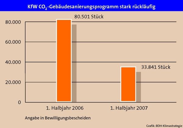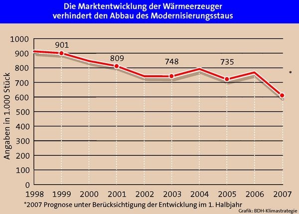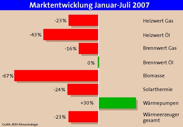 Im ersten Halbjahr 2007 brach der Markt für fast alle Wärmeerzeuger sowie Solarthermieanlagen (-24%) zweistellig ein, nur der Markt für Öl-Brennwertkessel stagnierte auf geringem Niveau. Mit einem Minus von 67% sind die mit Biomasse befeuerten Wärmeerzeuger am stärksten betroffen. Zugewinnen konnten lediglich Wärmepumpenheizungen, wobei hier die reinen Verkaufszahlen den Markt aufgrund besonderer Effekte Ende 2006 nicht realistisch repräsentieren, so dass der BDH in einer Gesamtprognose von einem Marktwachstum von 30% für Wärmepumpen ausgeht.