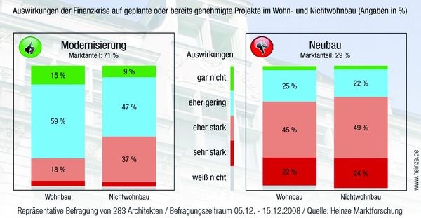 Die konkreten Auswirkungen der Finanzkrise sind nach Einschätzung der Architekten stärker im Neubau als in der Modernisierung zu spüren. Zu diesem Schluss kommt die