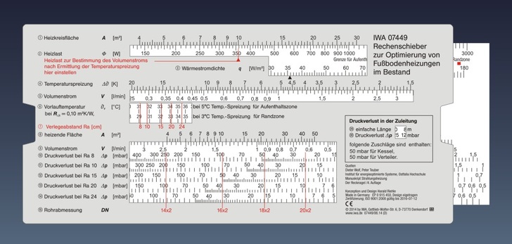 Der Datenschieber für Fußbodenheizungen IWA-07449 führt in zehn logischen und leicht verständlichen Rechenschritten zu einer hinreichend genau geplanten Fußbodenheizung und zu einem besseren Verständnis dieses modernen und komplexen Heizungssystems.
