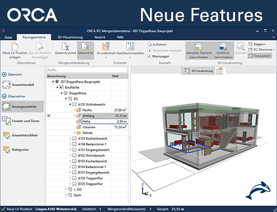 Die ORCA IFC & Mengenübernahme wird grafisch um eine 3D Darstellung des Projektes erweitert. Mengen der IFC-Datei können durch die zusätzlich visuelle Verortung im Modell schnell zugeordnet und ausgewählt werden.