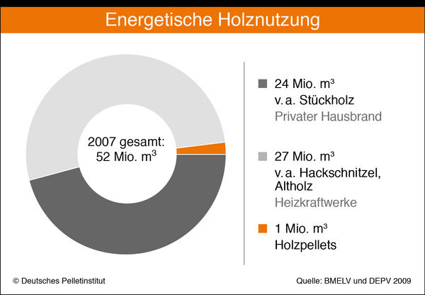 Der für die Pelleterzeugung benötigte Rohstoff stellt gegenüber den sonstigen energetischen Verwendungszwecken von Holz in Deutschland den mit Abstand kleinsten Anteil dar: Von den 2007 in Deutschland zur Holzenergie verbrauchten rund 52 Mio. m