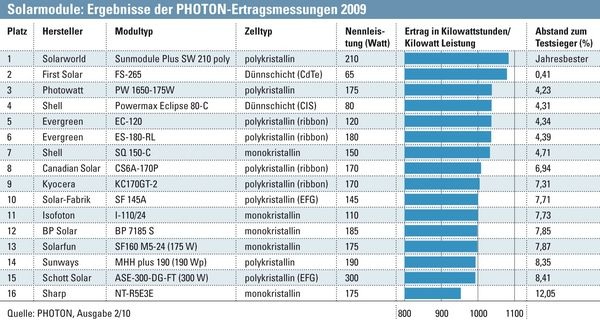 Das Solarstrom-Magazin Photon stellt in seiner Februar-Ausgabe Ergebnisse eines Langzeittests von Solarmodulen vor. Dazu hat das Photon-Labor 16 Modultypen von europäischen, asiatischen und amerikanischen Herstellern während des gesamten Jahresverlaufs 2009 vermessen. Den höchsten Ertrag lieferten dabei die polykristallinen Module „Sunmodule Plus SW 210 poly“ von Solarworld (Deutschland). An zweiter Stelle liegen die Dünnschichtmodule des US-Unternehmens First Solar. Das Modell „FS-265“ lieferte über das ganze Jahr gesehen nur 0,4 % weniger Elektrizität als das erstplazierte Modul. Auf Platz drei folgen die polykristallinen Module „PW 1650-175 W“ von Photowatt International SA (Frankreich). Sie leisteten 4,2 % weniger als der Spitzenreiter. Schlusslicht sind laut Photon Module des Typs „NT-R5E3E“ der Sharp Corp. Sie lieferten 12 % weniger Elektrizität als der Testsieger.