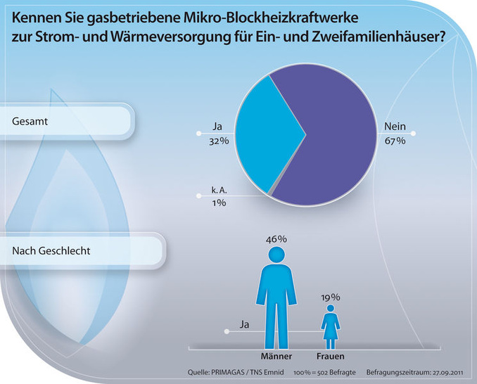 Bereits kurz nach der Markteinführung der ersten Modelle gasbetriebener Mikro-Blockheizkraftwerke (Mikro-BHKW) ist fast jedem dritten Deutschen diese Technik zur kombinierten Strom- und Wärmeerzeugung im Eigenheim ein Begriff. Das zeigt eine repräsentative Umfrage des Meinungsforschungsinstituts TNS Emnid im Auftrag des Flüssiggasversorgers