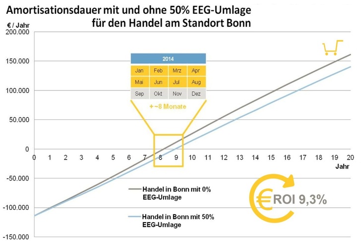 Mit einer EEG-Umlage von 50 % auf den Eigenverbrauch verlängert sich die Amortisationsdauer einer Solaranlage mit 95 kW p für ein Handelsunternehmen an einem Standort mit mittlerer Sonnenstrahldauer nur um rund acht Monate. Die Rentabilität einer solchen Anlage liegt bei 9,3 %; der Gewinn (Nettobarwert) beträgt 466 Euro/kW p .