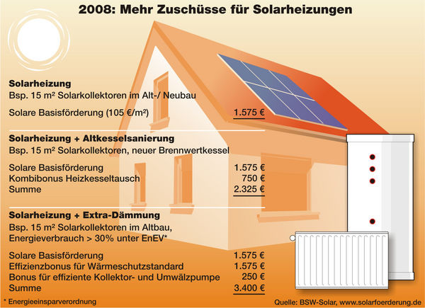 ) bezogen auf das Fördervolumen und bei besonders sparsamer Technik auch bezogen auf die einzelne Anlage deutlich auf. Eigenheimbesitzer, die 2008 eine Solarheizung installieren und zugleich deutliche Maßnahmen zur Energieeinsparung an der thermischen Gebäudehülle ergreifen, können beispielsweise einen Zuschuss von bis 3400 Euro für eine Solaranlage mit Heizungsunterstützung mit 15 m² Kollektorfläche erhalten. Daneben gibt es einen Kombinationsbonus von 750,- Euro, wenn Biomasseheizkessel oder Wärmepumpen zusammen mit einer Solaranlage neu installiert werden.