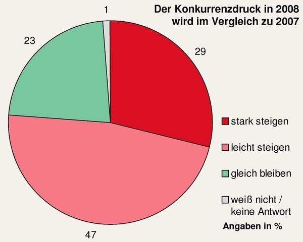 unter insgesamt 460 Niederlassungen des Baustoffhandels erwarten 76% der Befragten, dass der Konkurrenzdruck in 2008 im Vergleich zum Vorjahr steigen wird. Fast 30% erwarten sogar, dass der Konkurrenzdruck in 2008 stark steigen wird. Auch im überwiegend mittelständisch geprägten deutschen Baustoffhandel schreitet die Konzentration voran und der Wettbewerb unter den Händlern verstärkt sich. Nur knapp ein Viertel geht in diesem Jahr von keiner Wettbewerbssteigerung oder Wettbewerbsminderung aus. Insgesamt ist die Richtung jedoch klar: Keiner der Befragten geht von einem abnehmenden Konkurrenzdruck aus.