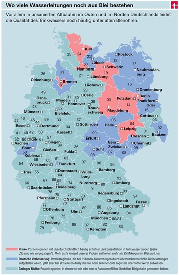 Um diese Frage fundiert beantworten zu können, hat die Stiftung Warentest in den letzten 15 Jahren rund 37.000 Trinkwasserproben untersucht. Diese Messergebnisse sind in die aktuelle Version der Blei-Umweltkarte (Download als PDF) eingeflossen. Auf ihr kann man sehen, in welchen Regionen sich die Wasserbelastung verbessert oder verschlechtert hat. Im Großen und Ganzen ist das Leitungswasser in Deutschland von guter Qualität, Gefahr droht jedoch in Haushalten, deren Wasser durch alte Bleirohre fließt.