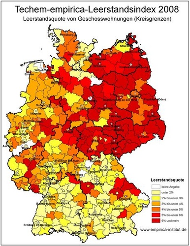 Ausgewertet wurden insgesamt 100 Städte. Die niedrigsten Leerstände haben die westdeutschen Städte Erlangen (0,4 %), Karlsruhe (0,8 %), Baden-Baden und Kempten (je 0,9 %), Memmingen (1,0 %) sowie Ingolstadt und München (je 1,1 %). Leerstände mit zehn % und mehr haben die ostdeutschen Städte Frankfurt (Oder) mit 10,0 %, Gera mit 11,1 %, Halle (Saale) mit 13,6 % und Schwerin als Schlusslicht der Auswertung mit 15,4 %. Im Westen haben Emden (13,6 %), Pirmasens (8,3 %), Bremerhaven (5,8 %) und Straubing (5,6 %) die höchsten Quoten. Bei den Bundesländern haben Hamburg mit 1,3, gefolgt von Baden-Württemberg und Bayern mit jeweils 1,8 % die niedrigsten Wohnungsleerstände. Schlusslicht ist Sachsen-Anhalt mit 9,0 %. ToR