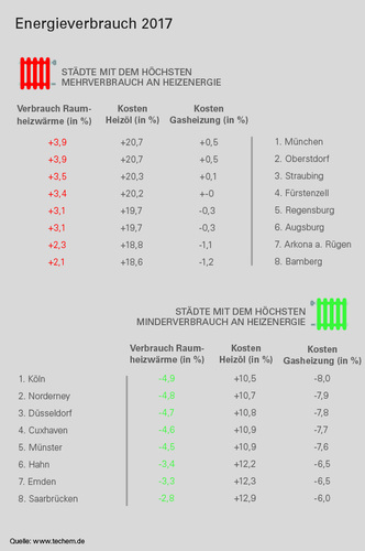 Höhere Heizkosten für Heizöl dürften gemäß der Techem-Prognose besonders auf Mieter aus dem Süden Deutschlands zukommen. Obwohl das Jahr 2017 im Bundesdurchschnitt um 0,7 % wärmer als 2016 war, weisen die Münchner und Oberstdorfer Mieter auf Basis der Temperaturwerte einen Mehrverbrauch von 3,9 % auf, gefolgt von Straubing mit 3,5 %, Fürstenzell mit 3,4 % sowie Regensburg und Augsburg mit jeweils 3,1 %. Einzig die Einwohner aus dem hohen Norden, nämlich Arkona auf Rügen, haben ebenfalls einen Mehrverbrauch an Raumheizwärme um 2,3 %. Regionen mit rückläufigen Verbräuchen sind beispielsweise Köln (–4,9 %), Norderney (–4,8 %) oder Düsseldorf (–4,7 %).